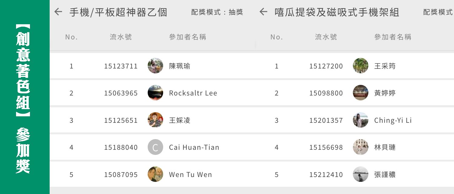 恭喜以下得獎者獲得參加獎,已Email發送得獎通知;