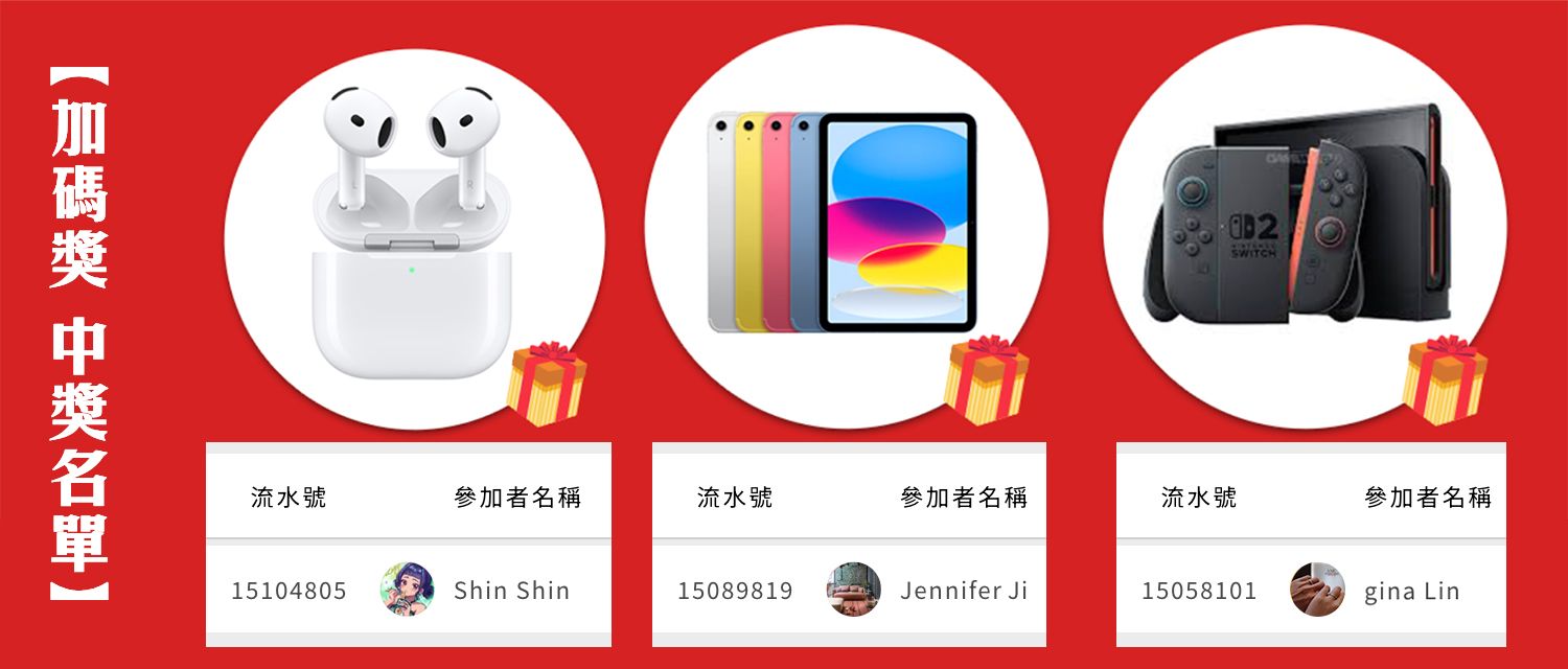 2. 加碼獎:AirPods 4 主動式降噪款(共一名)、iPad 11 A16/11吋WiFi/128G(共一名)、Switch 2 / OLED版(共一名)