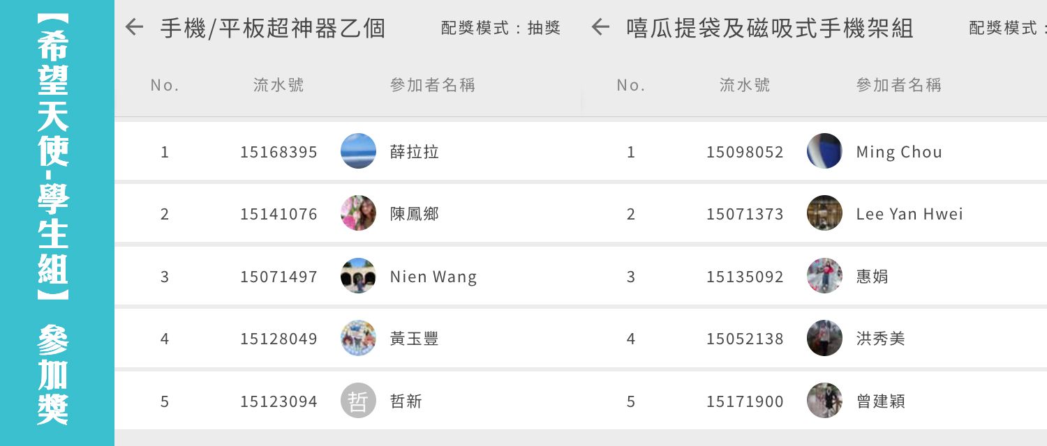 恭喜以下得獎者獲得參加獎,已Email發送得獎通知;